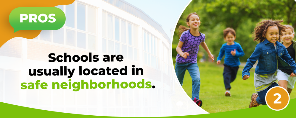 Schools prioritize safety. Many schools have tight security measures around their campuses. Police and local law enforcement also have a more active presence near schools and surrounding neighborhoods. If you're a home buyer who is looking for a safe community, living near a school or within a school district can be beneficial for you. Of course, this might not apply to every single community, so don’t forget to check the local crime maps to verify information about neighborhood safety in general.